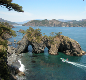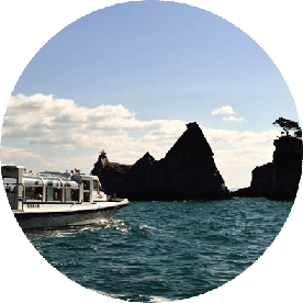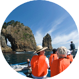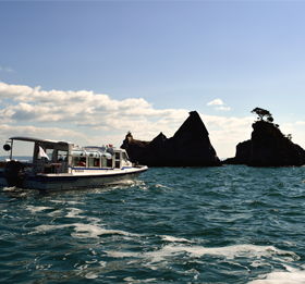 這是乘船巡遊陡峭的斷崖與在驚濤駭浪中誕生出的奇岩怪石、洞窟連綿的北山崎。「北山崎斷崖巡遊」是乘坐觀光船巡遊弁天崎、矢越崎、北山崎,還可體驗給黑尾鷗餵食。「北山崎平底舟船探險」(預約制)是乘坐由當地漁夫操縱的小型漁船「平底舟船」在斷崖正下方巡遊。