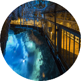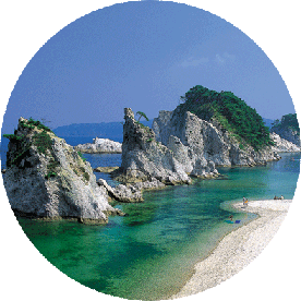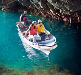 乘坐小型漁船「平底舟船」遊覽被稱為淨土之濱的「青色洞窟」的八戶穴。因從洞窟入口射入的太陽光,能夠欣賞到高透明度的海水閃爍著翡翠綠、蔚藍色光輝的絕美景色。據說看到潮水從洞窟最深處的孔穴吹出的現象的人能夠實現願望。不可預約。