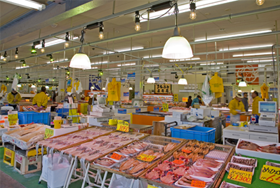 排列著約50家店舖,可購買新鮮的海產和蔬菜,以及在餐飲店品享用美食。還可當場烤製剛買的海產品進行享用。通常還可參觀、體驗只有企業才能參加的拍賣。早市僅限週日及節假日,但週四以外相鄰的觀光物產設施「楓樹館」有營業,可用餐及購物。