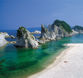 這是宮古代表性的景點。因江戶時代宮古的靈鏡和尚感歎「宛如極樂淨土」而得名。尖銳的白色流紋岩林立,松之綠、岩肌之白、海之蔚藍映襯地描繪出美麗的風景。風情隨季節而變,冬季銀裝素裹的景色也別具風情。