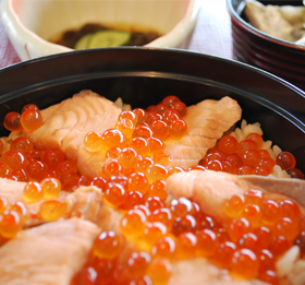 這是擁有約400年歷史、發源於宮城縣亙理町的鄉土料理。使用醬油、日本酒和紅糖柔軟地燉煮秋鮭,將鮭魚子在剛煮好的醬汁中撈一下。將融入了秋鮭的香甜湯汁與米飯一起炊製,並在上面放上煮好的秋鮭魚與鮭魚子。在亙理町,到了時令的秋季,約有20家餐飲店提供腹子飯。