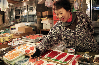 是魚市場賣魚、充滿活力的阿媽。會用方言和動作手勢接待遊客。請輕鬆地進行搭話。
